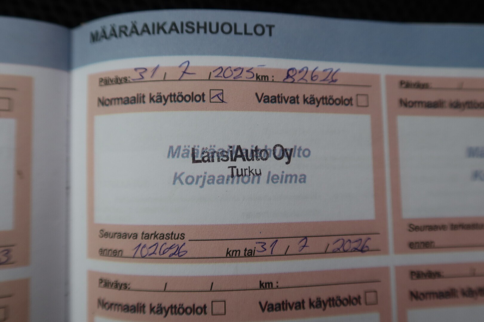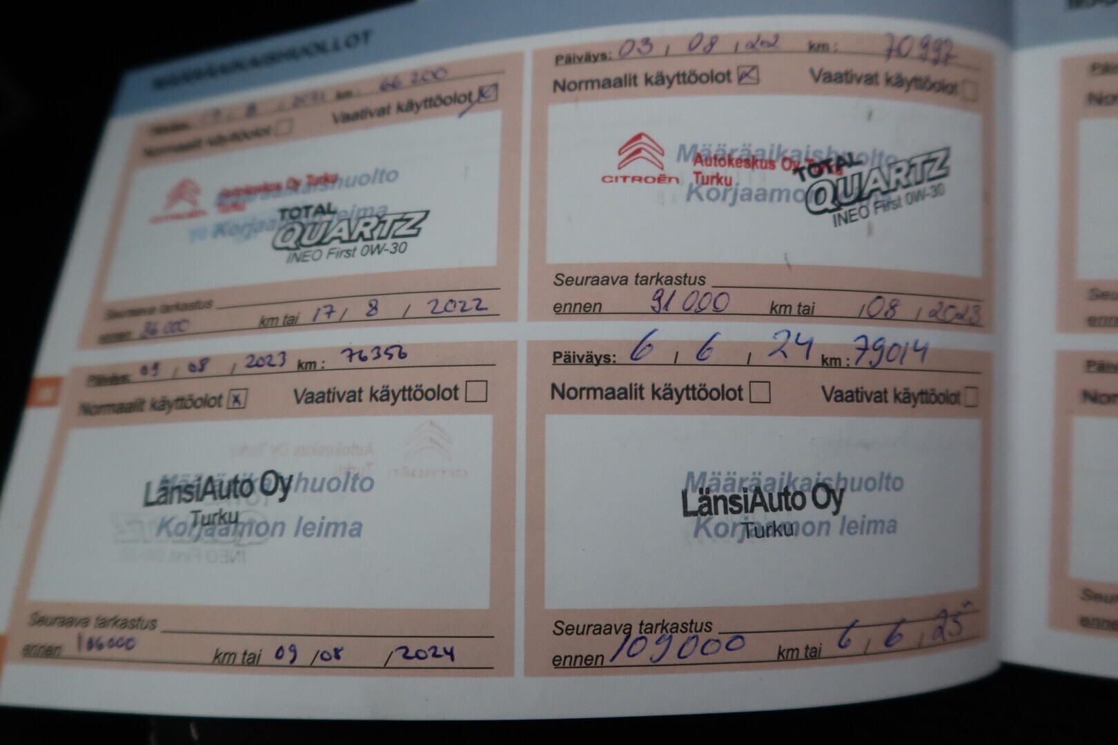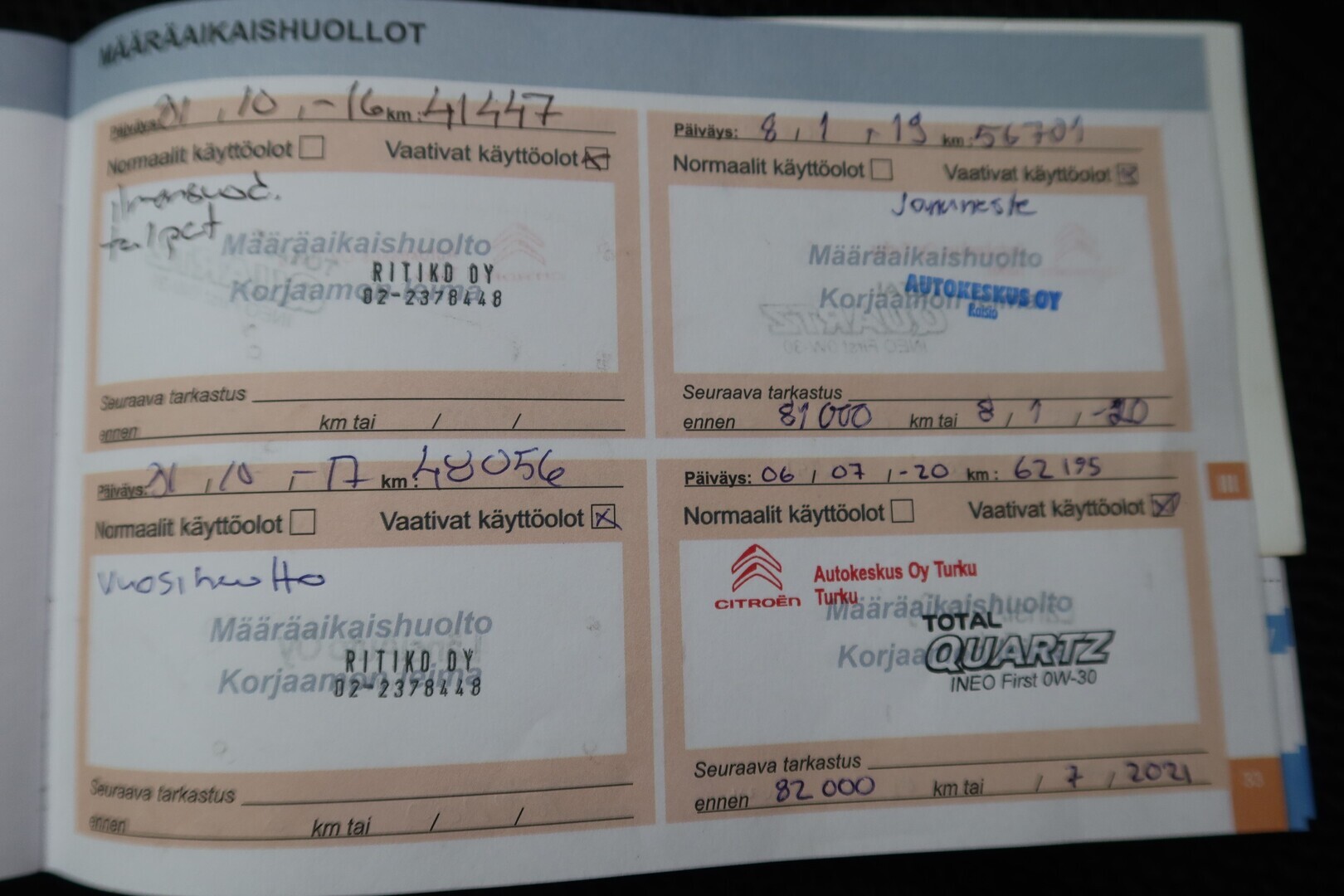 Huoltokirja, viimeisin huolto tehty n. 82tkm. ajettuna, jakopää on ketjulla!