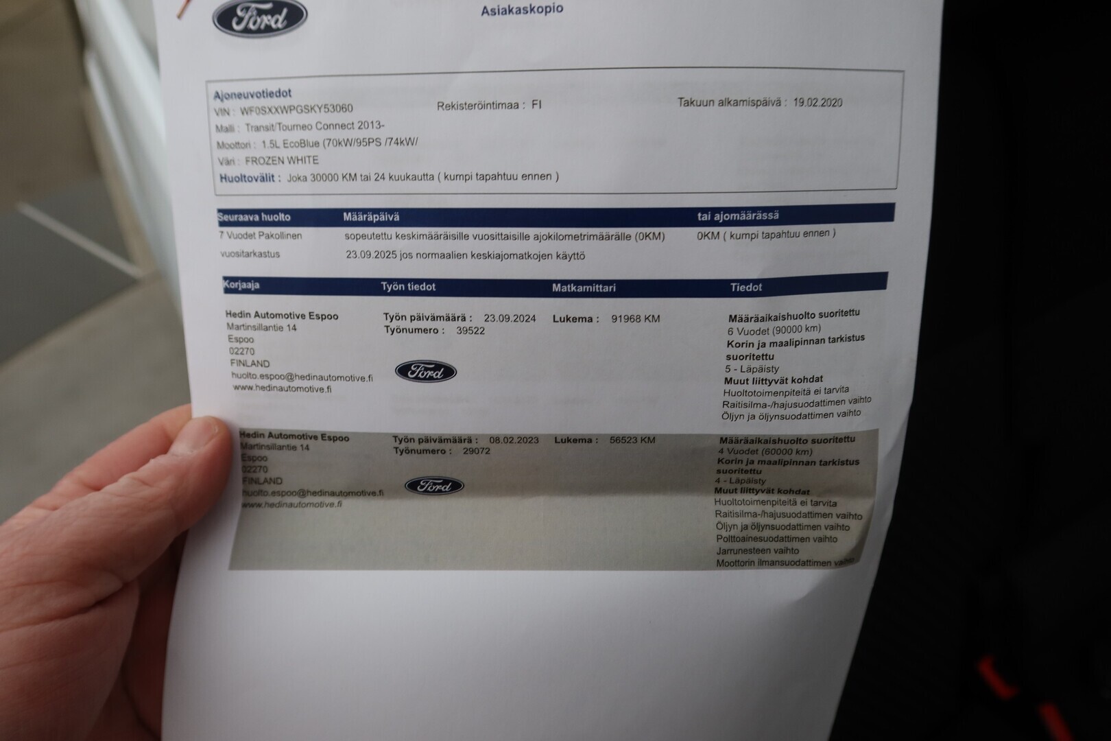 Huoltokirja, viimeisin huolto tehty (iso huolto) 1/2026, 118tkm kohdalla