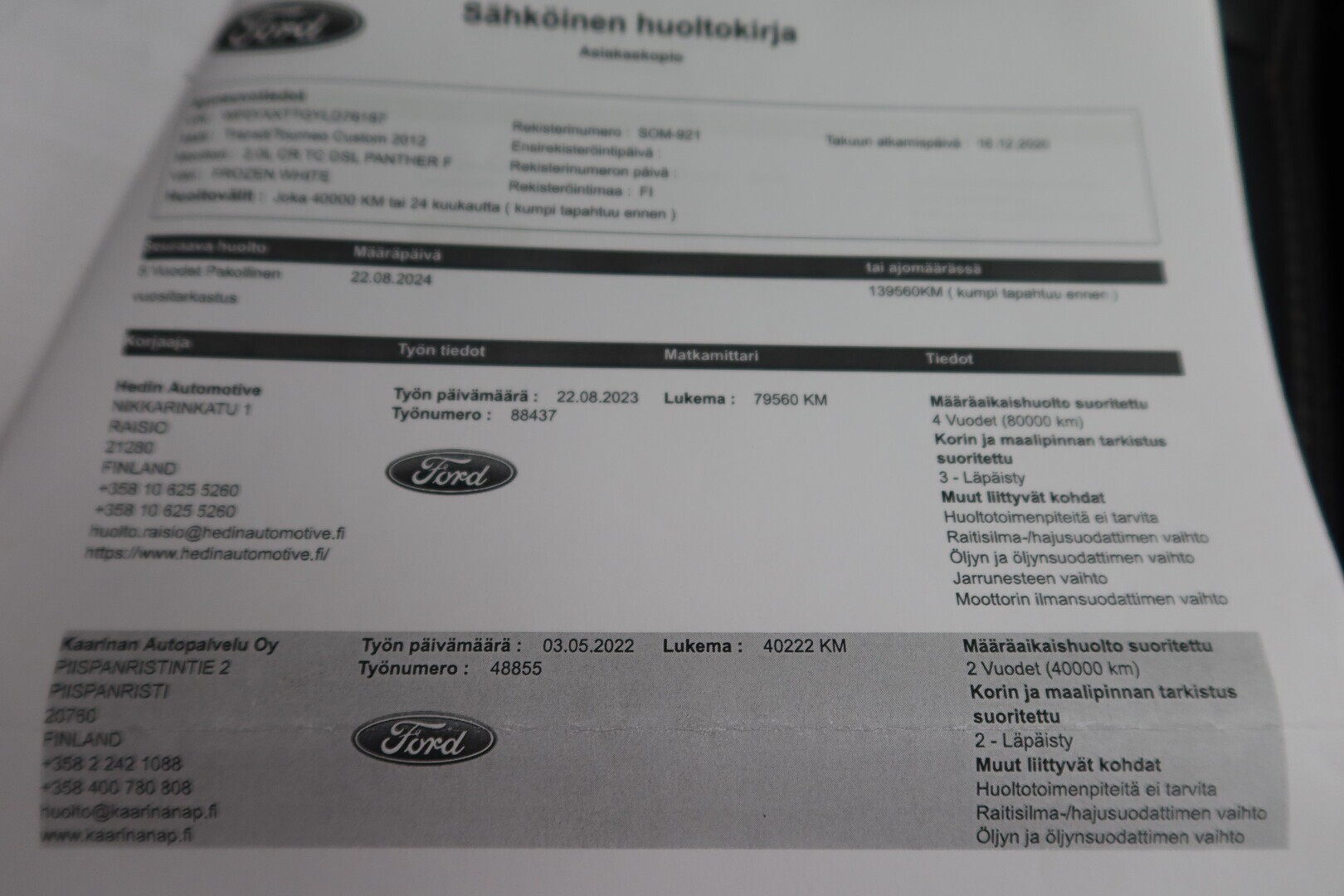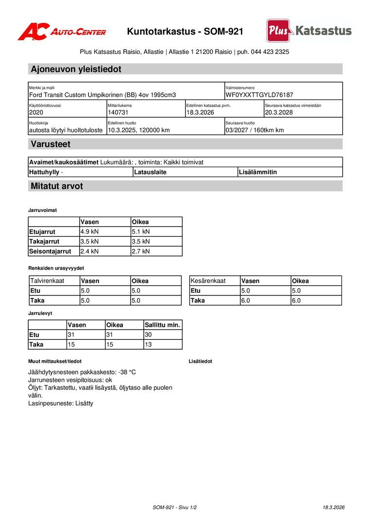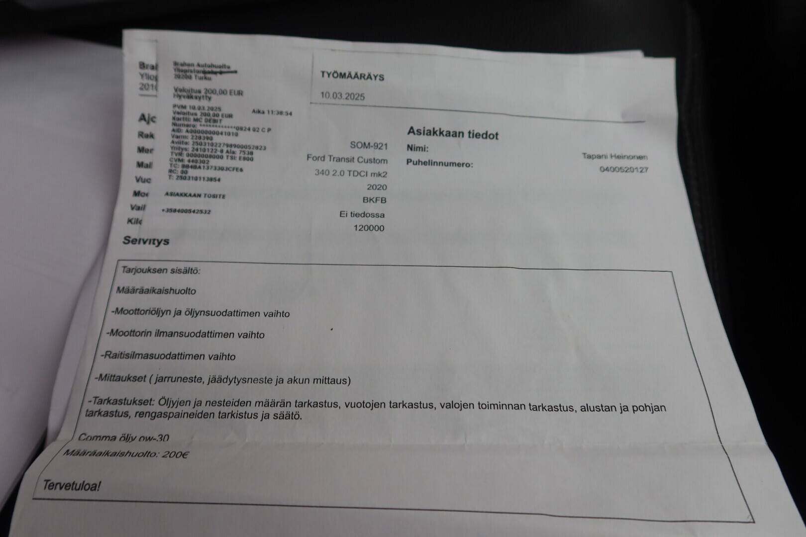 Huoltokirja, viimeisin huolto tehty 03/2025 120 TKM kohdalla.