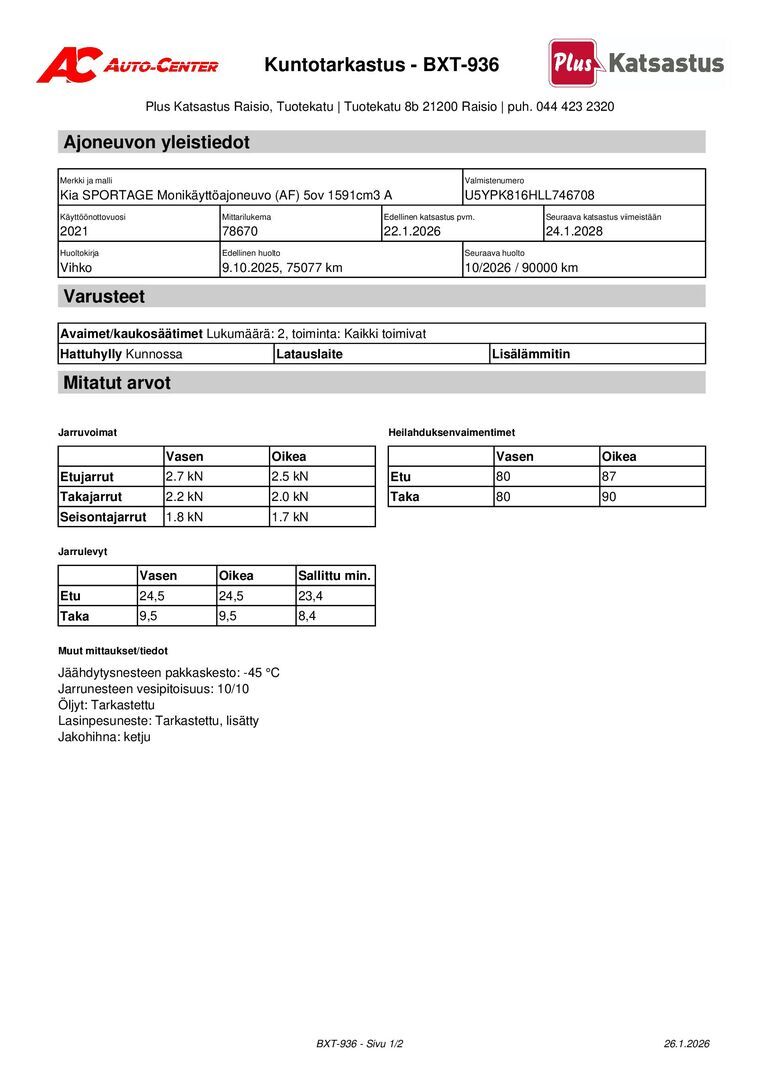 Huoltokirja, viimeisin huolto tehty 10/2025 70tkm.