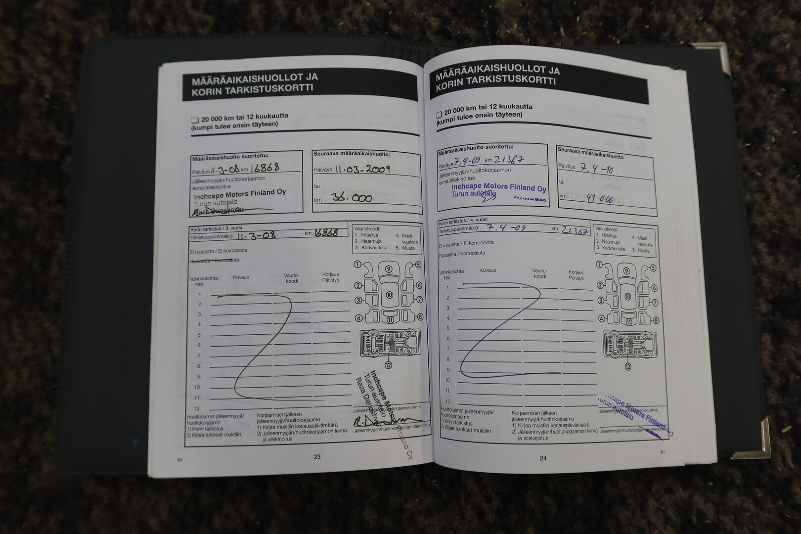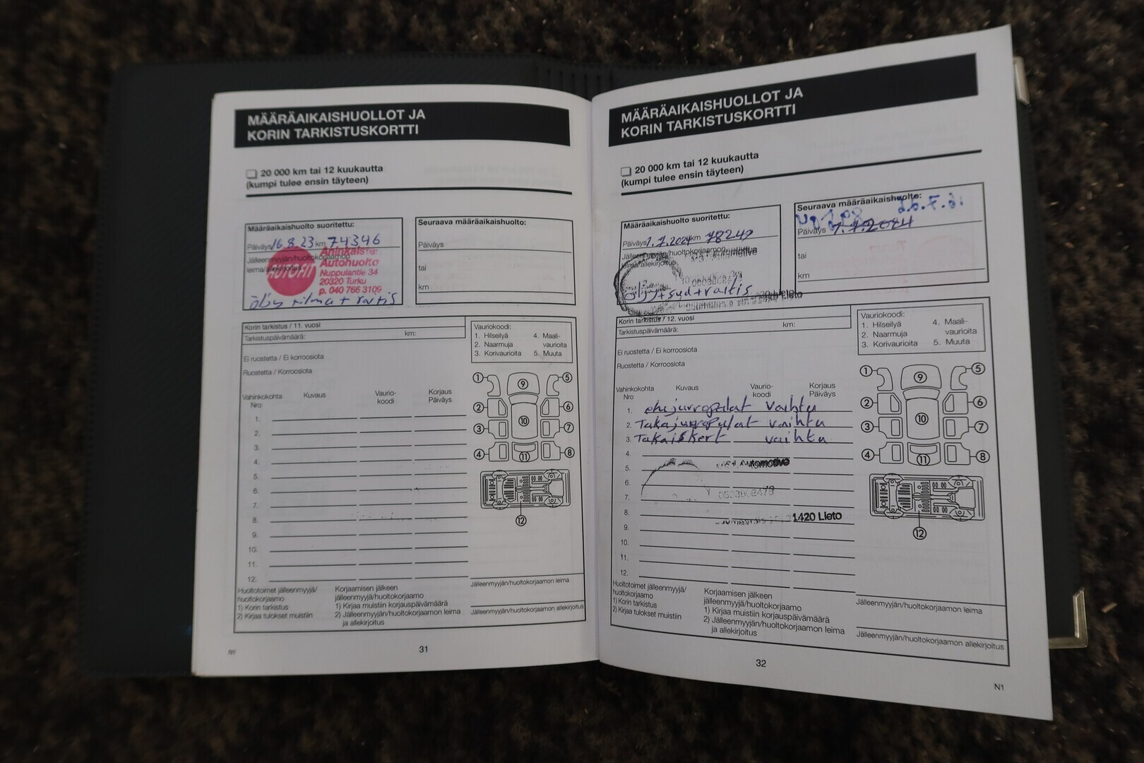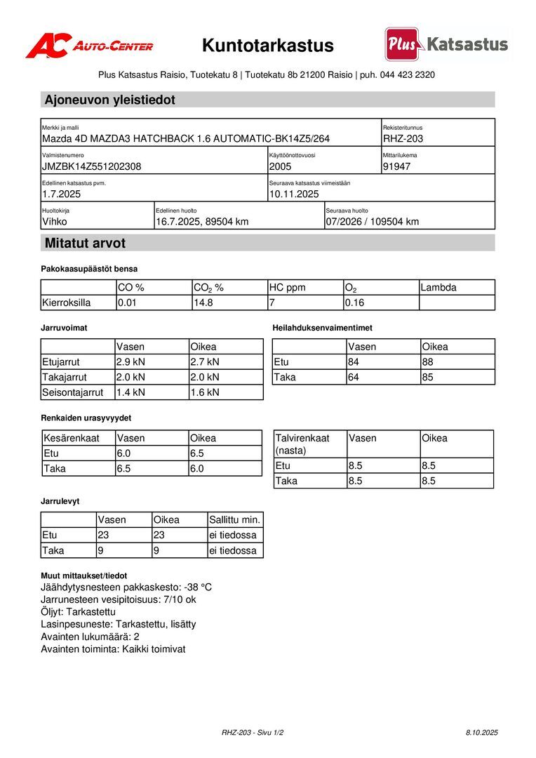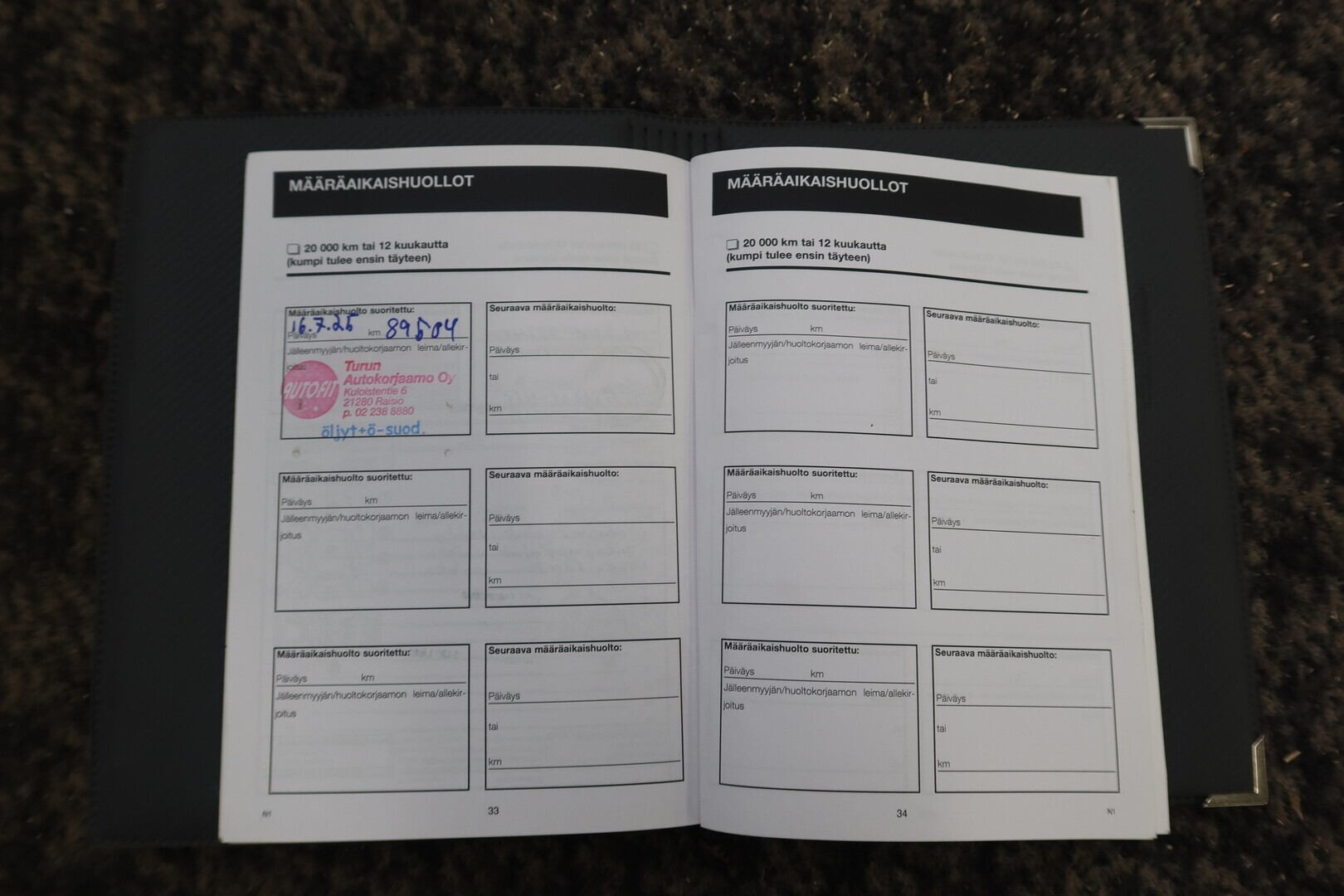 Huoltokirja, viimeisin huolto tehty 87tkm 07/2025