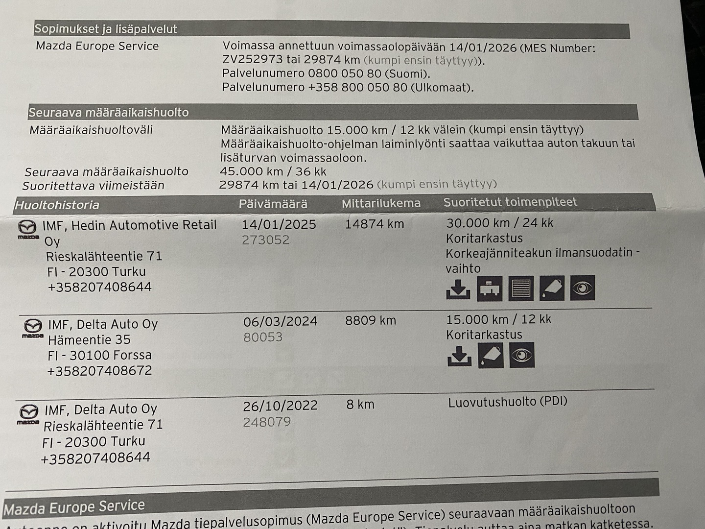 Täydellinen merkkiliikkeen huoltokirja, viimeisin huolto 1/2025 14874km kohdalla
