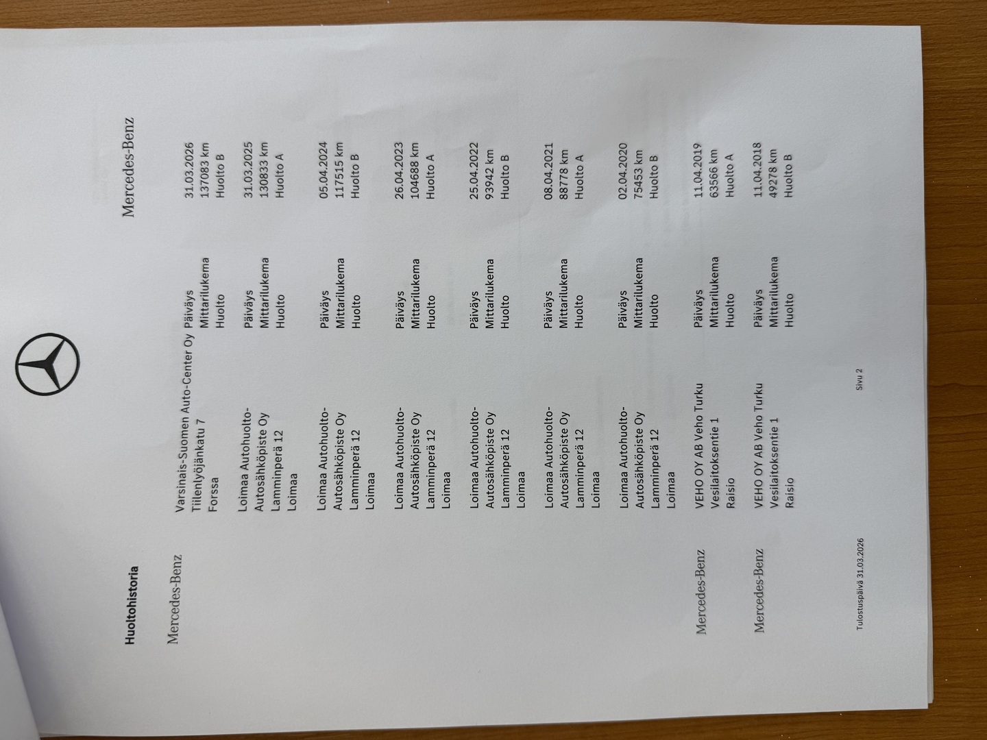Täydellinen sähköinen huoltokirja, viimeisin huolto Mercedes merkkihuollossa 137083km/ 31.03.2026 Varsinais-Suomen Auto-Center Oy Forssa