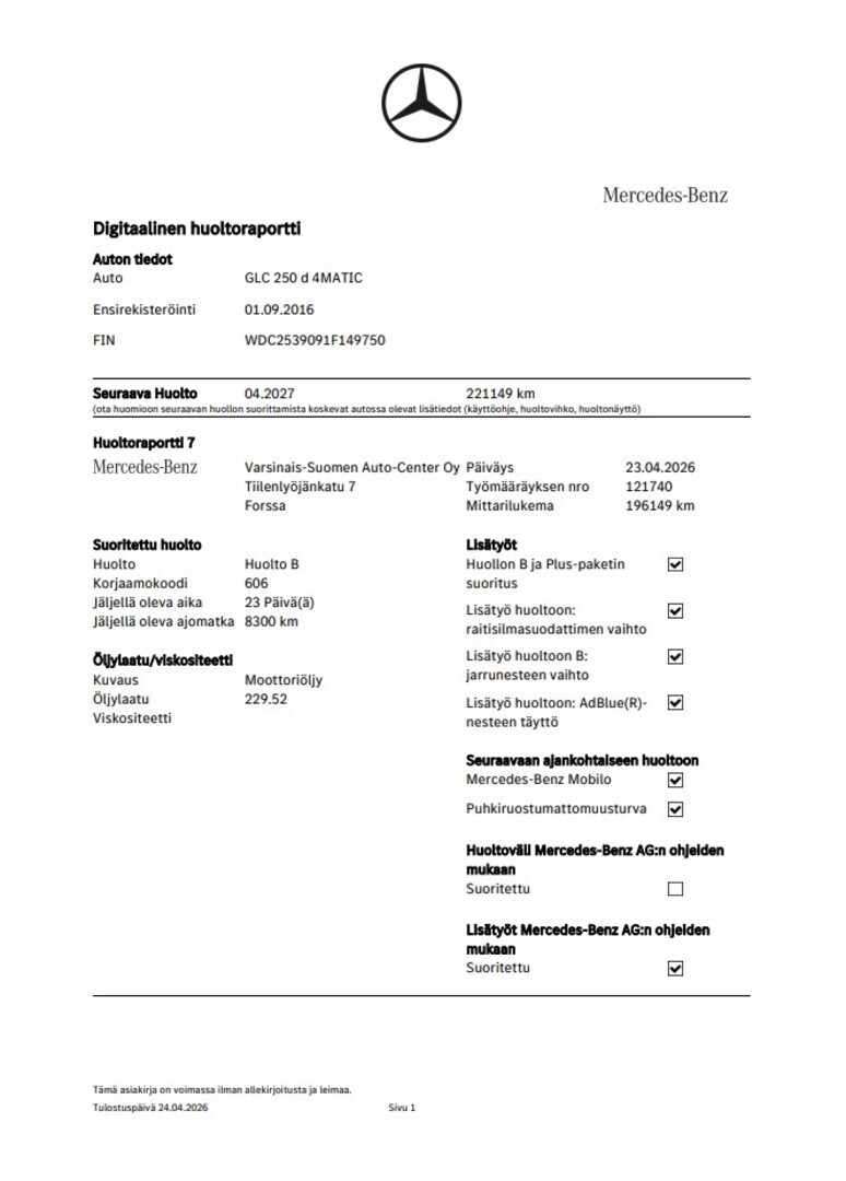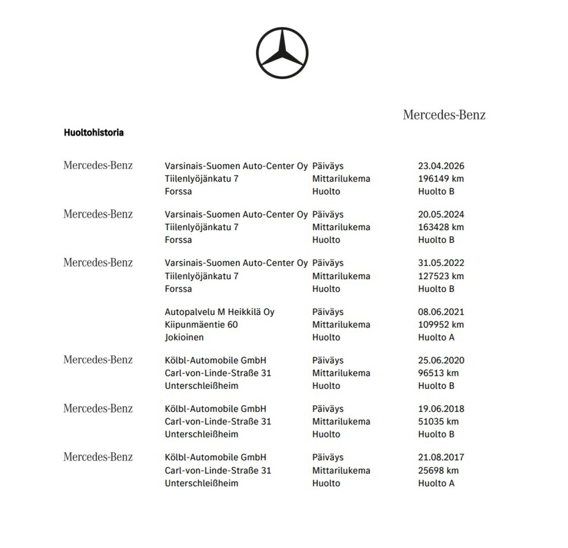 Huoltokirja, vimeisin huolto 23.4.2026 196tkm kohdalla Mercedes-merkkihuollossa, Auto-Center Forssa. MB-Mobilo voimassa