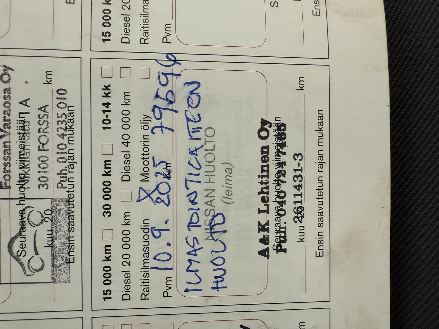 Huoltokirja, Juuri huollettu 79593km/ 10.09.2025 Moottori öljyt, ilmastointi huolto, yms ..A&K Lehtinen Oy