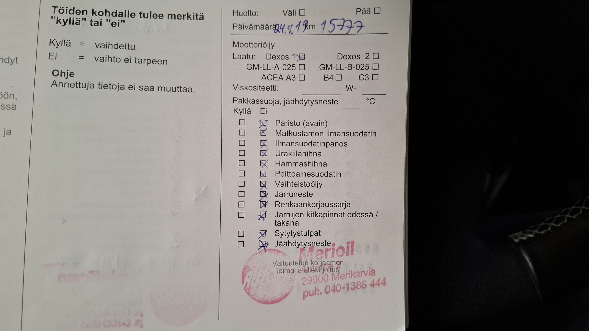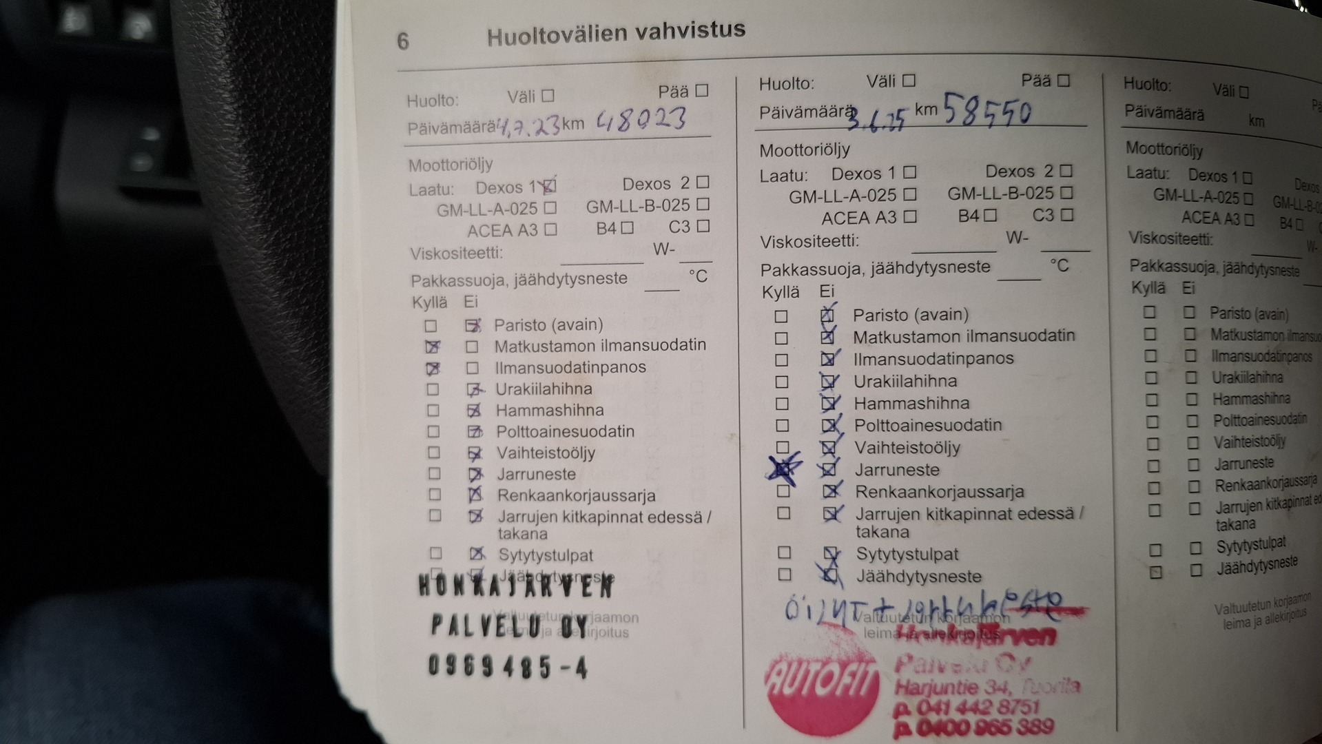 Huoltokirja, viimeisin huolto tehty 3.6.2025 / 58550km.