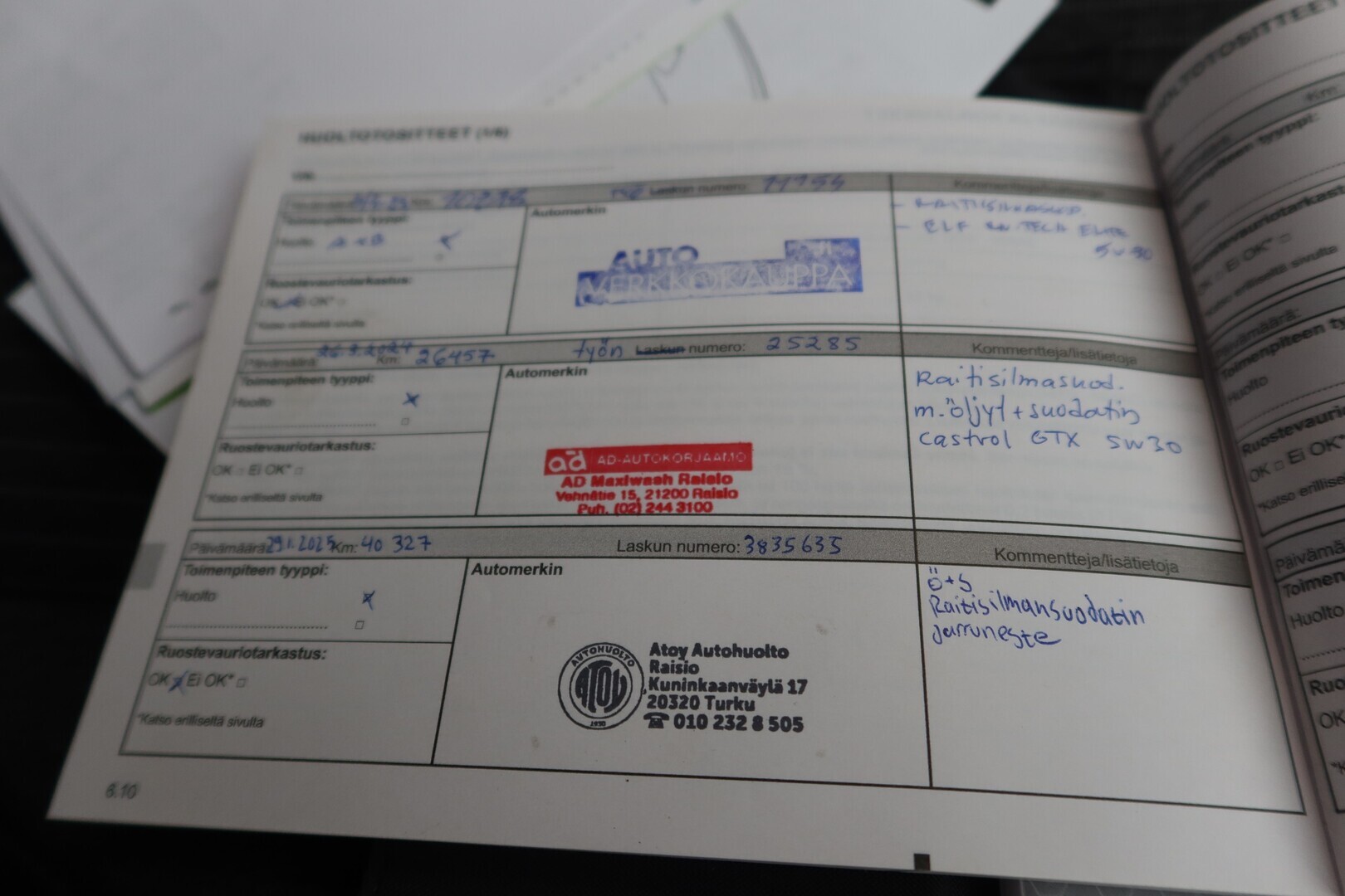 Huoltokirja, viimeisin huolto tehty 01/2025