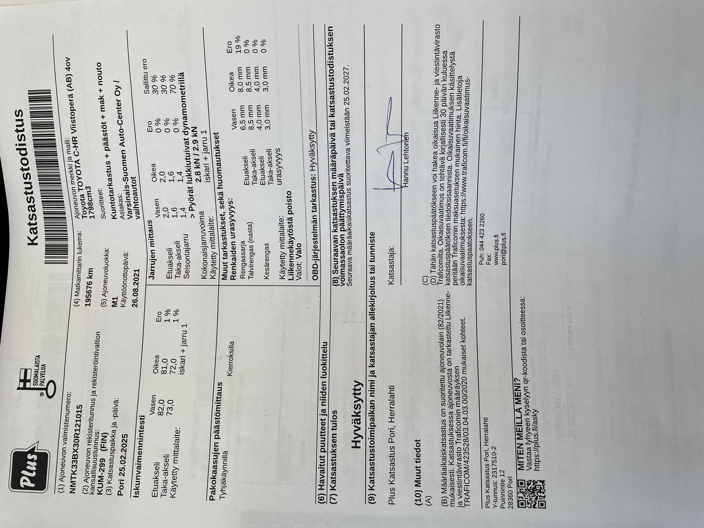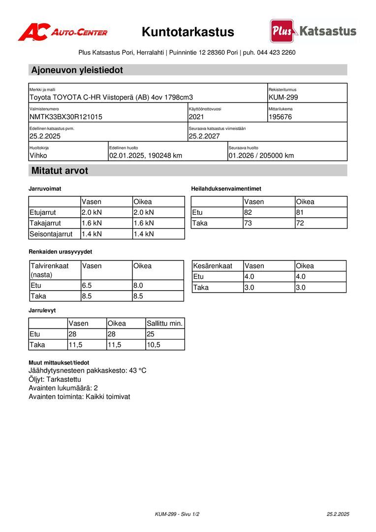 Huoltokirja, viimeisin huolto tehty 1/2025.