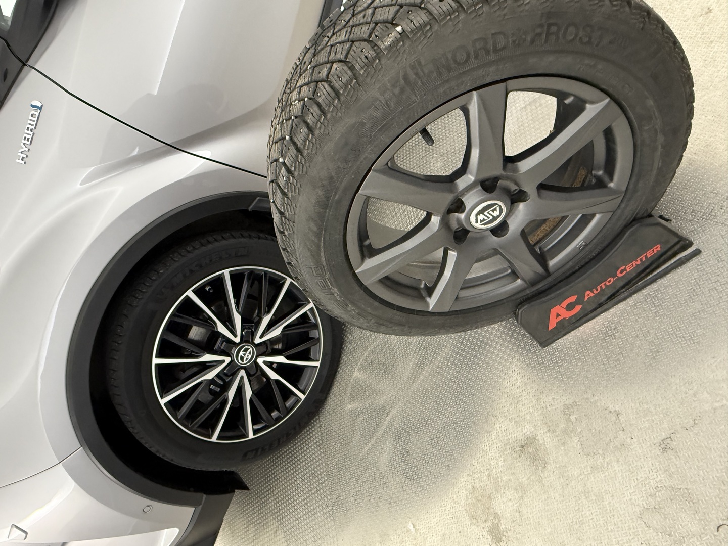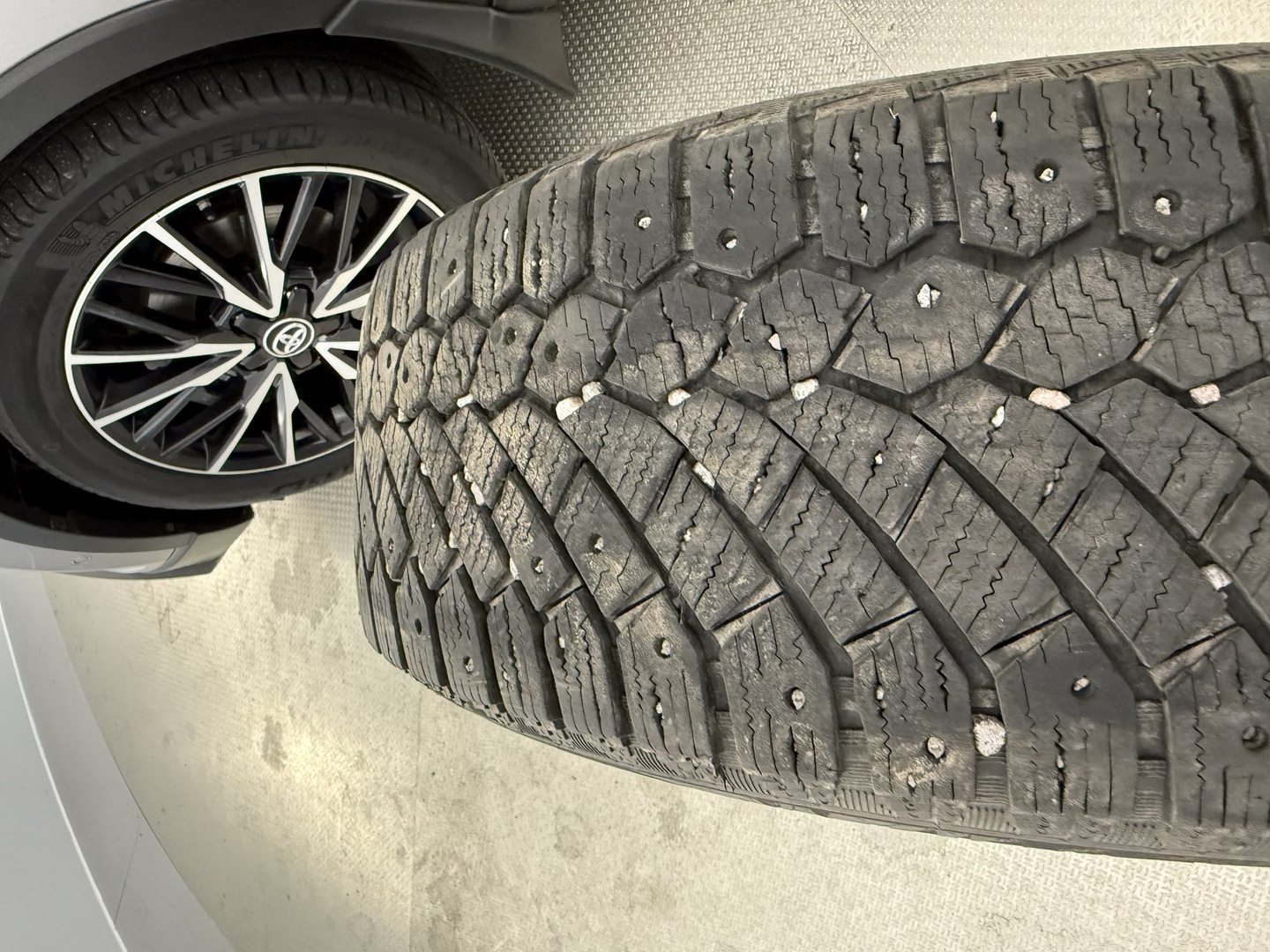 Kahdet renkaat, myydään uusilla nastarenkailla.