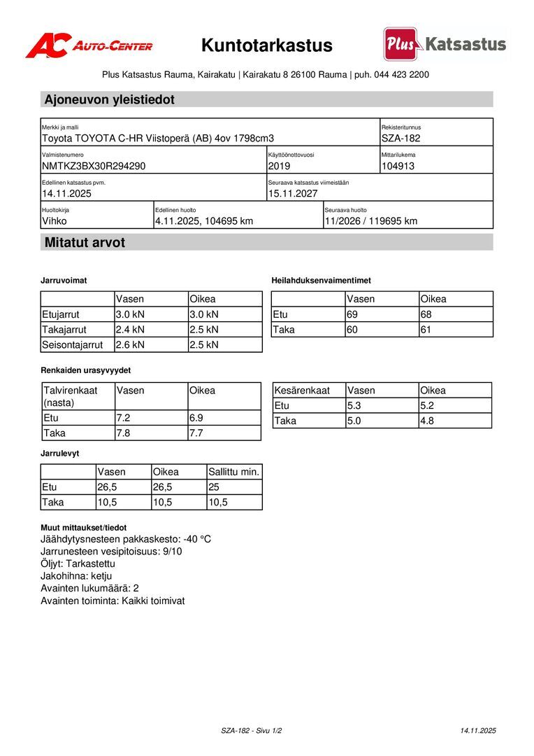 Huoltokirja, viimeisin huolto tehty 11/2025 104695km
