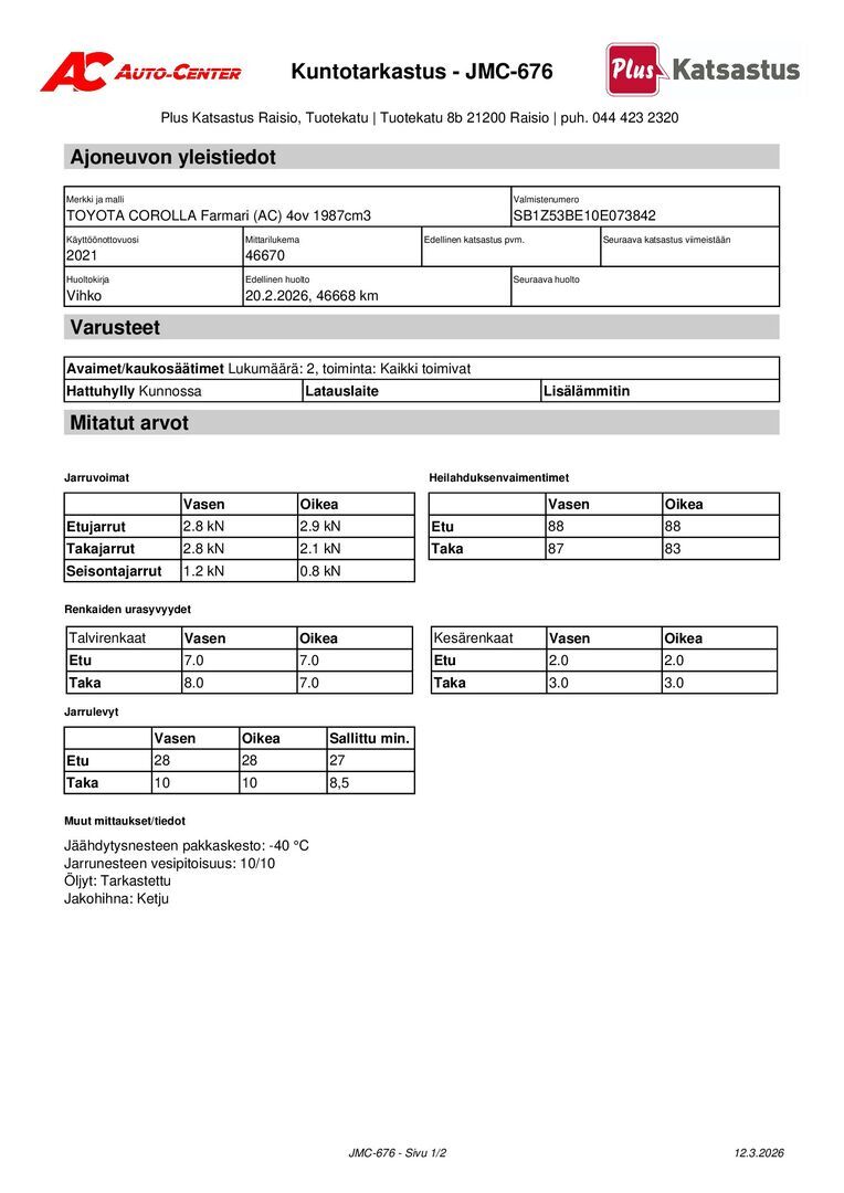 Täydellinen merkkiliikkeen huoltokirja, viimeisin huolto tehty 02/26/46TKM