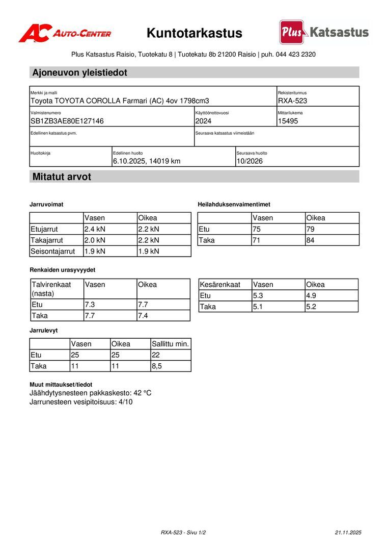 Täydellinen merkkiliikkeen huoltokirja, viimeisin huolto tehty 10/2025 14 TKM kohdalla.