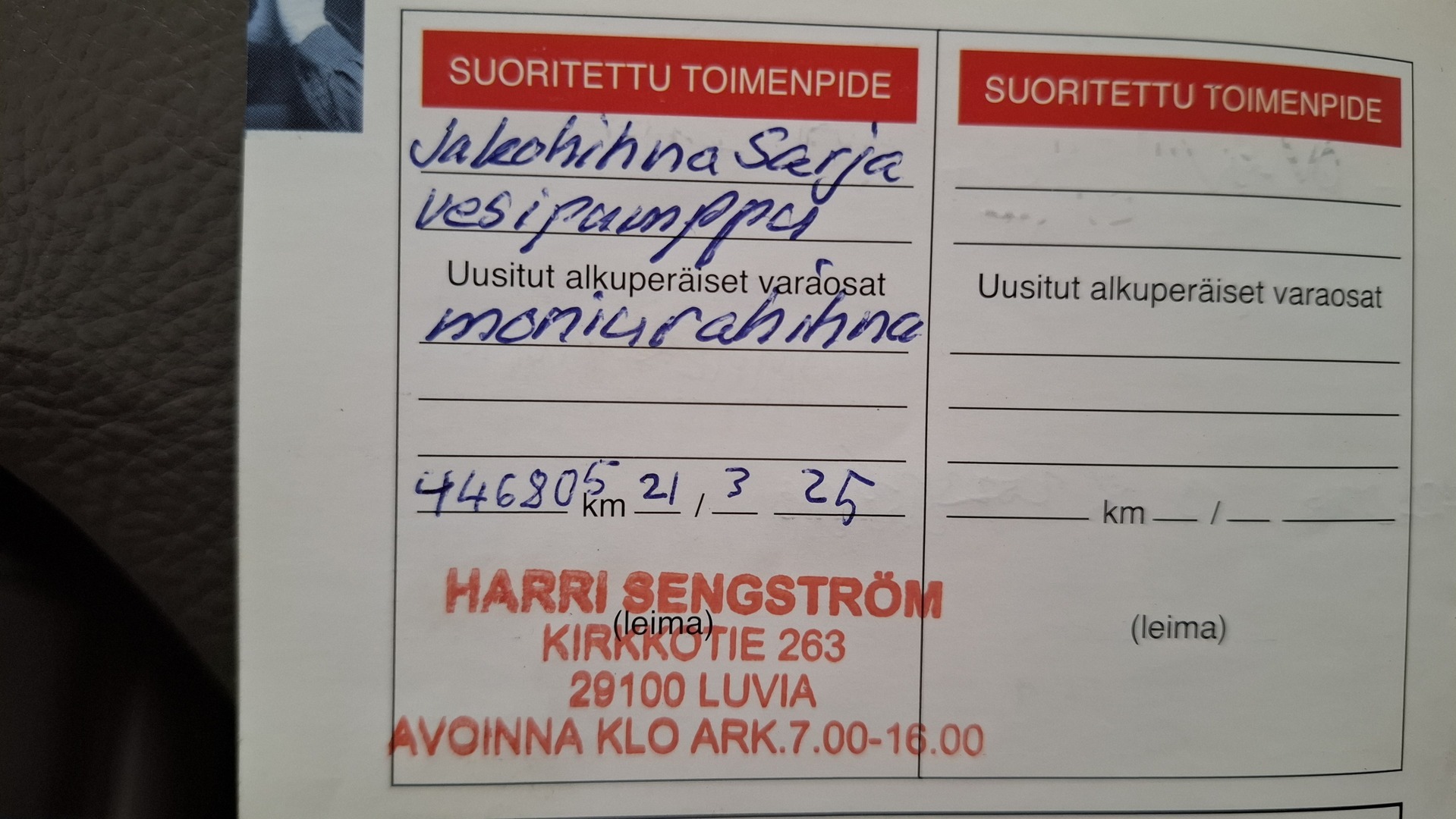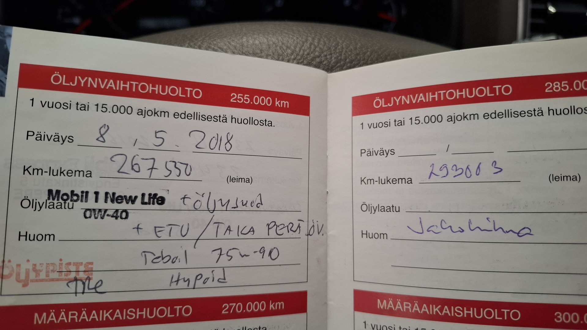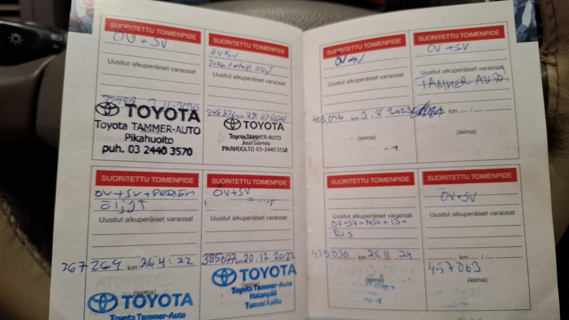 Huoltokirja, viimeisin huolto tehty 457063km.