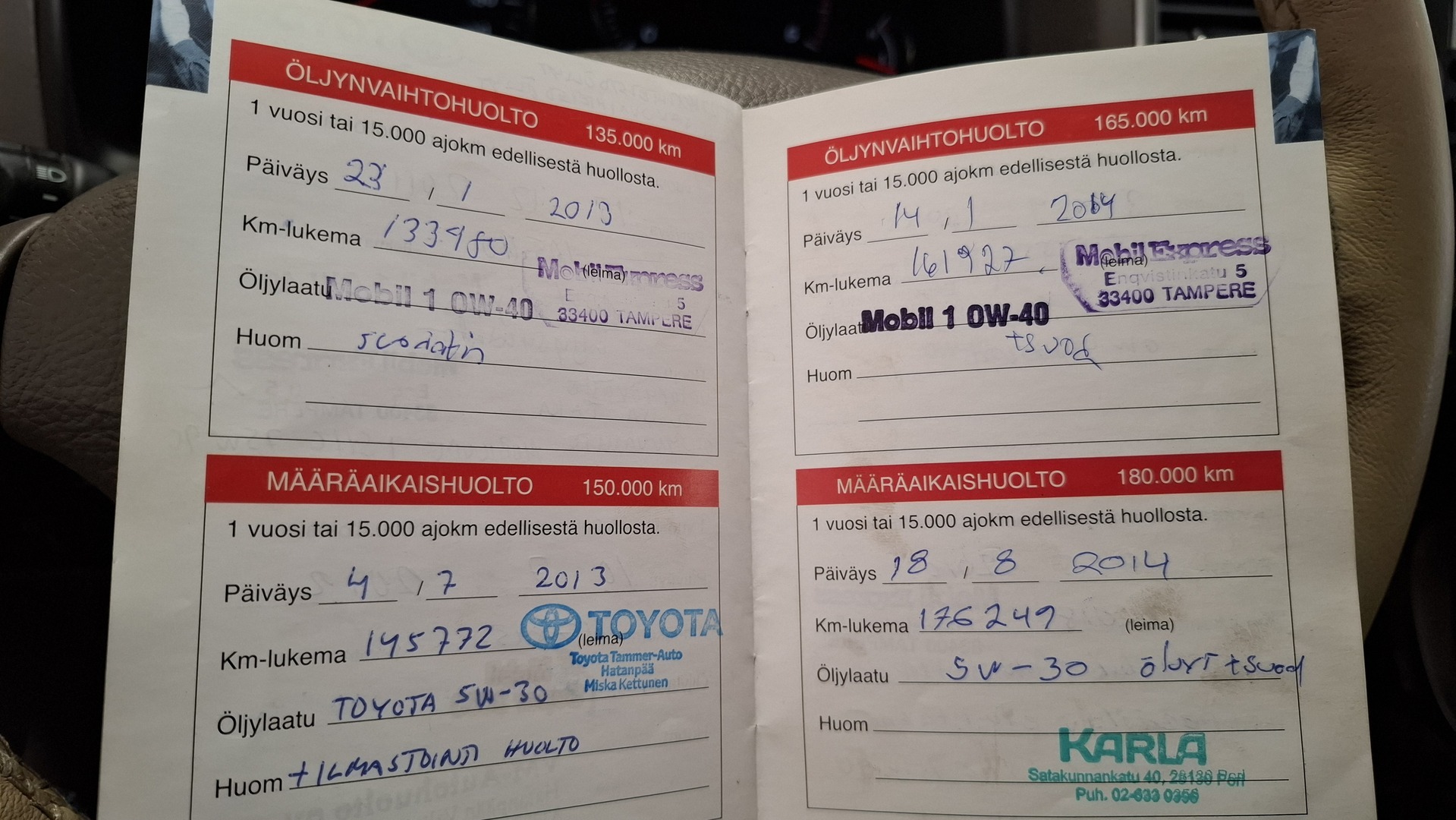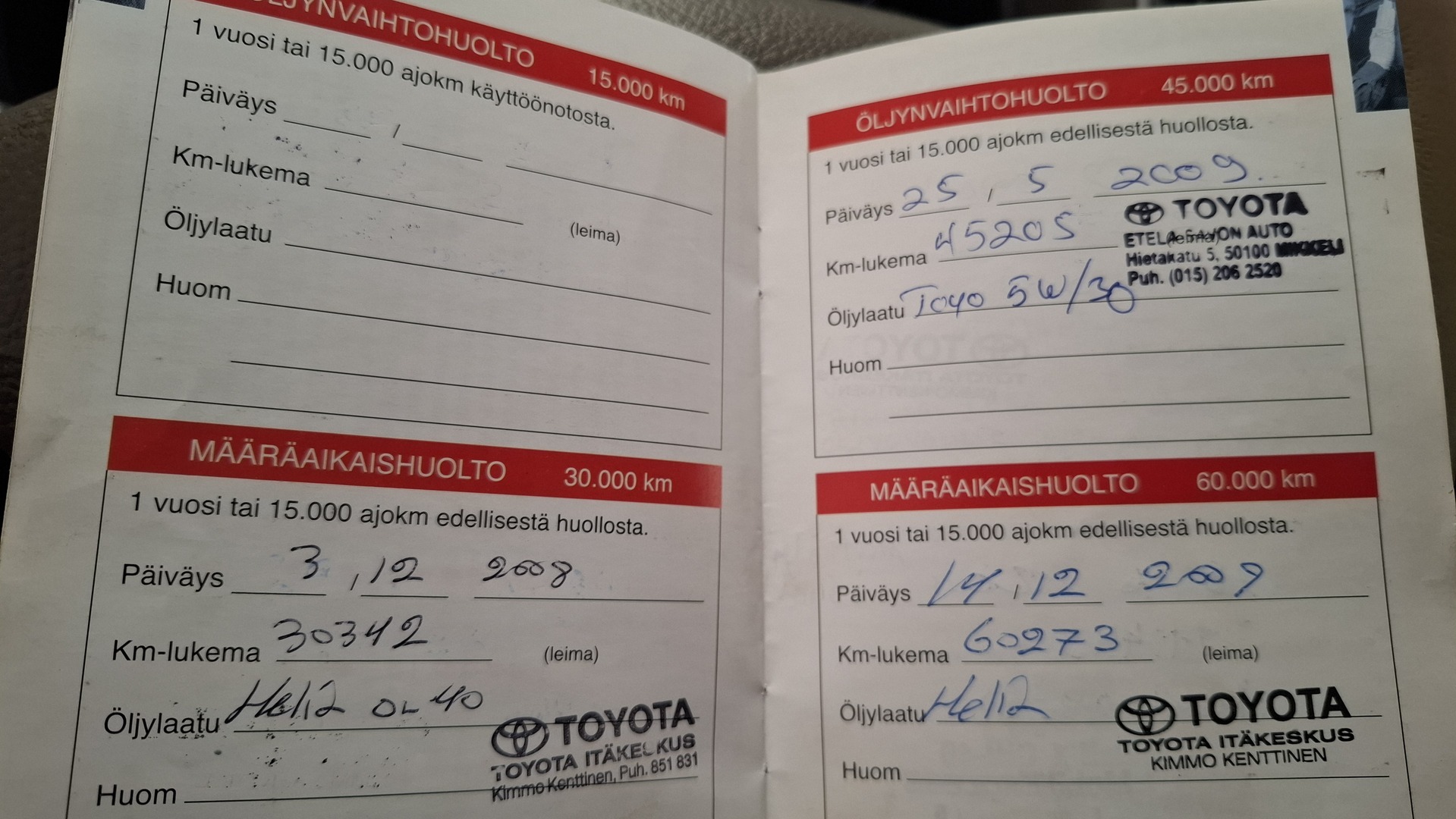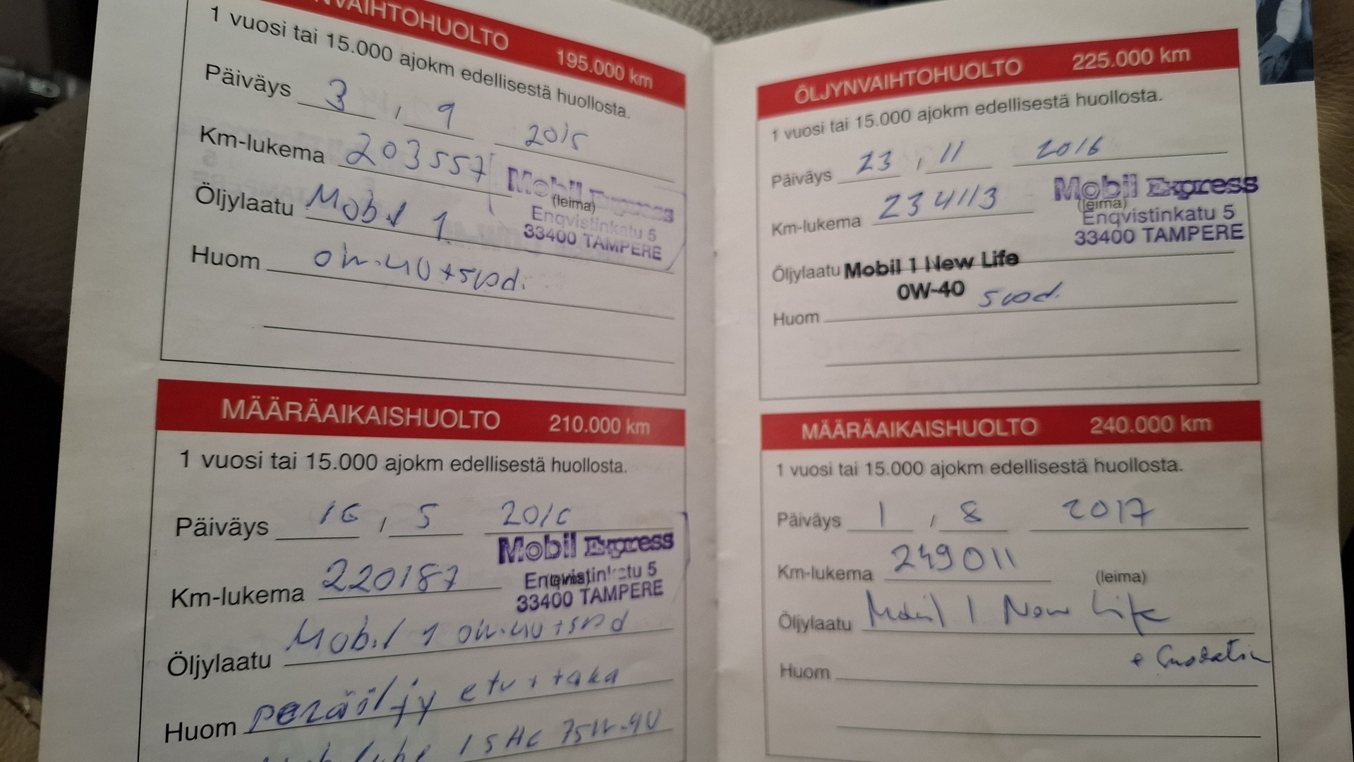 Huoltokirja, viimeisin huolto tehty 457063km.