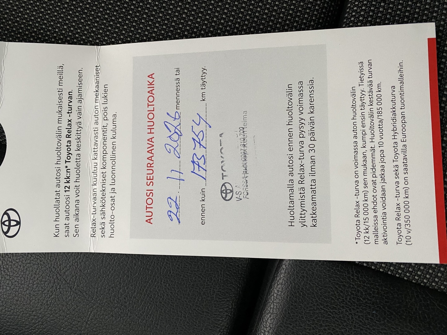 Täydellinen merkkiliikkeen huoltokirja, viimeisin huolto 11/2024, 133tkm kohdalla. Seuraava huolto 11/2026 tai 173tkm kohdalla, kumpi täyttyy ensin.