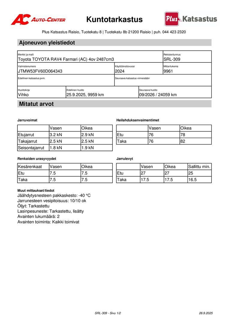 Täydellinen merkkiliikkeen huoltokirja, viimeisin huolto tehty 09/2025 9 TKM kohdalla.