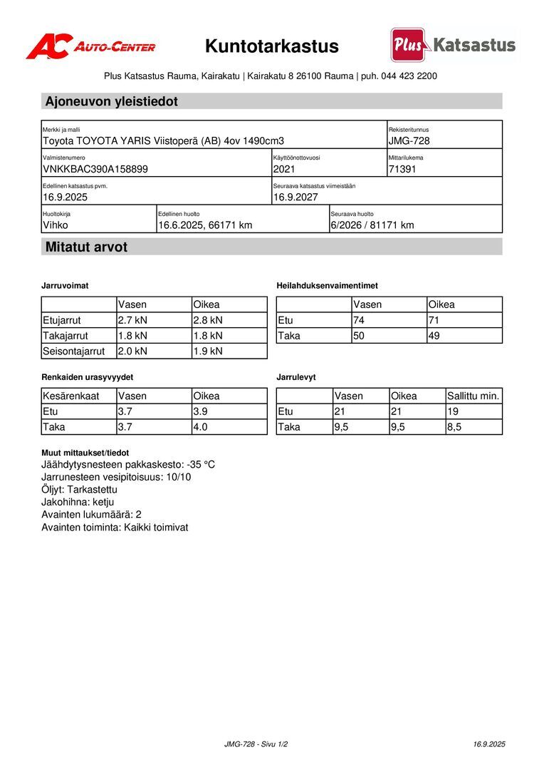Viimeisin huolto 6/2025 66171km