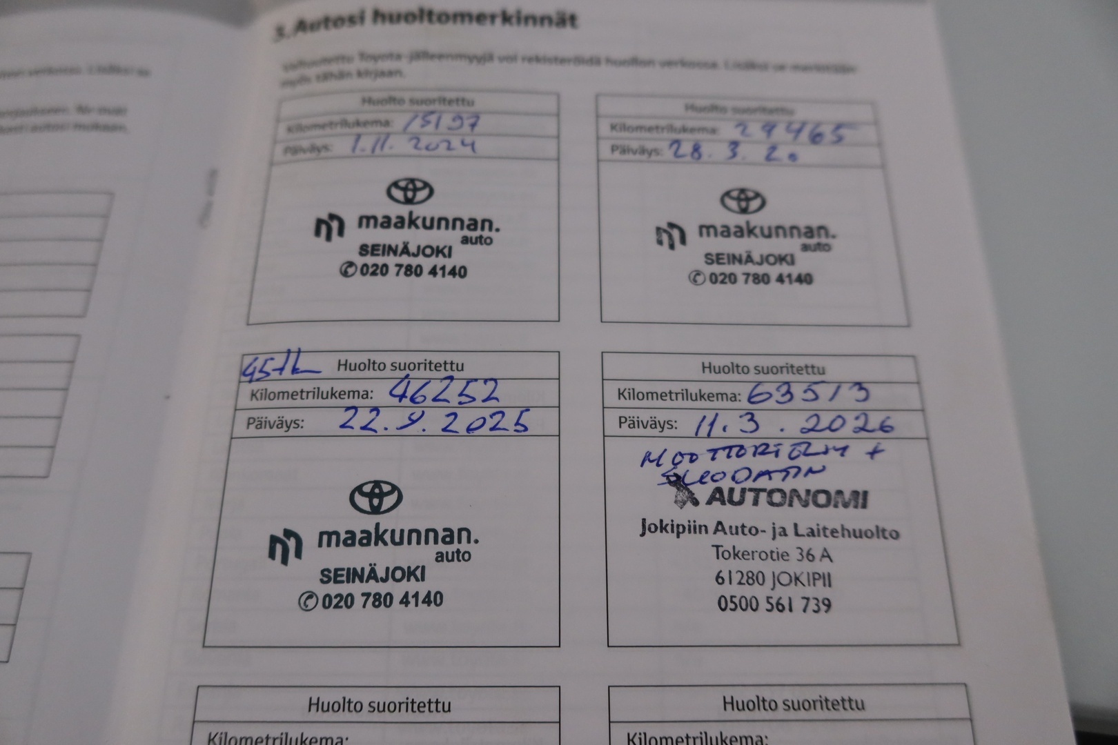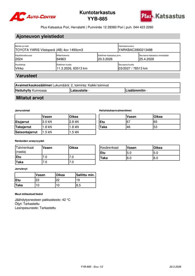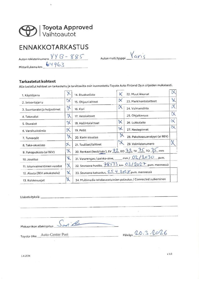 Täydellinen merkkiliikkeen huoltokirja, viimeisin huolto tehty 11.3.26/63tkm