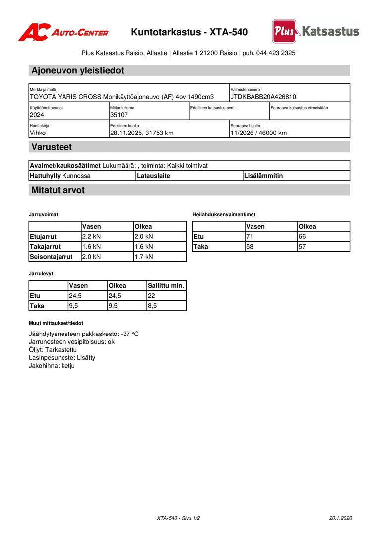 Täydellinen merkkiliikkeen huoltokirja, viimeisin huolto tehty 11/2025 31 TKM kohdalla