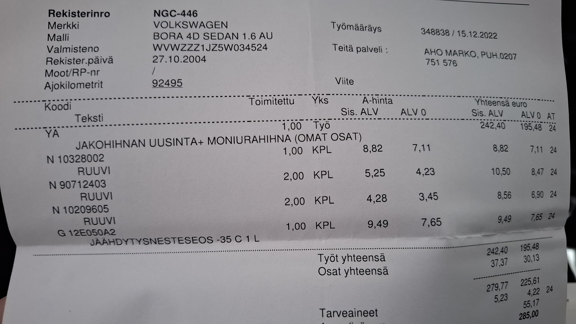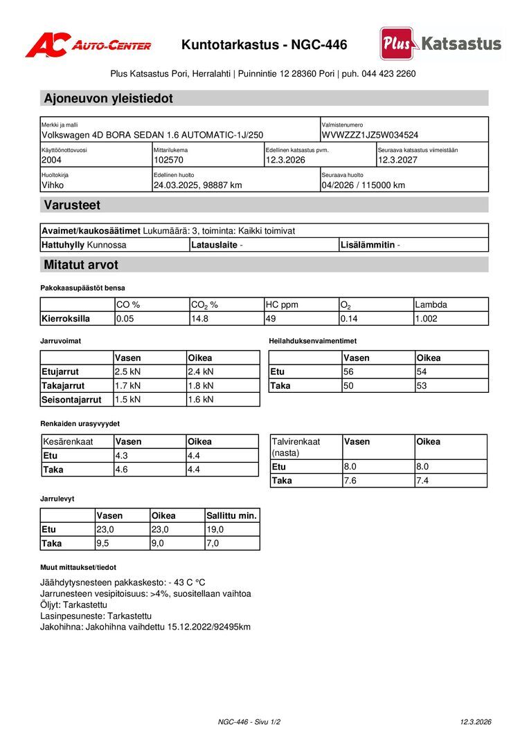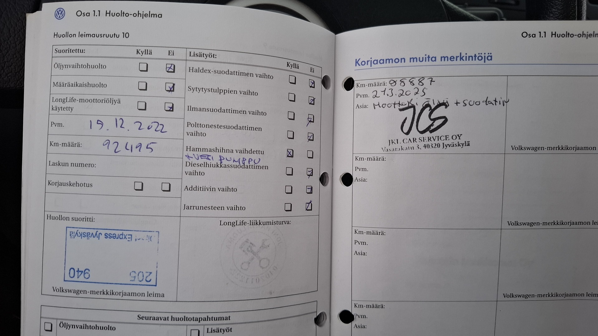 Huoltokirja, viimeisin huolto tehty 98887km / 21.3.2025