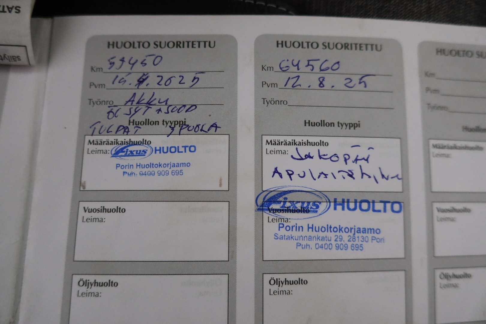 Huoltokirja, viimeisin huolto tehty 8/2025 ja 64500km