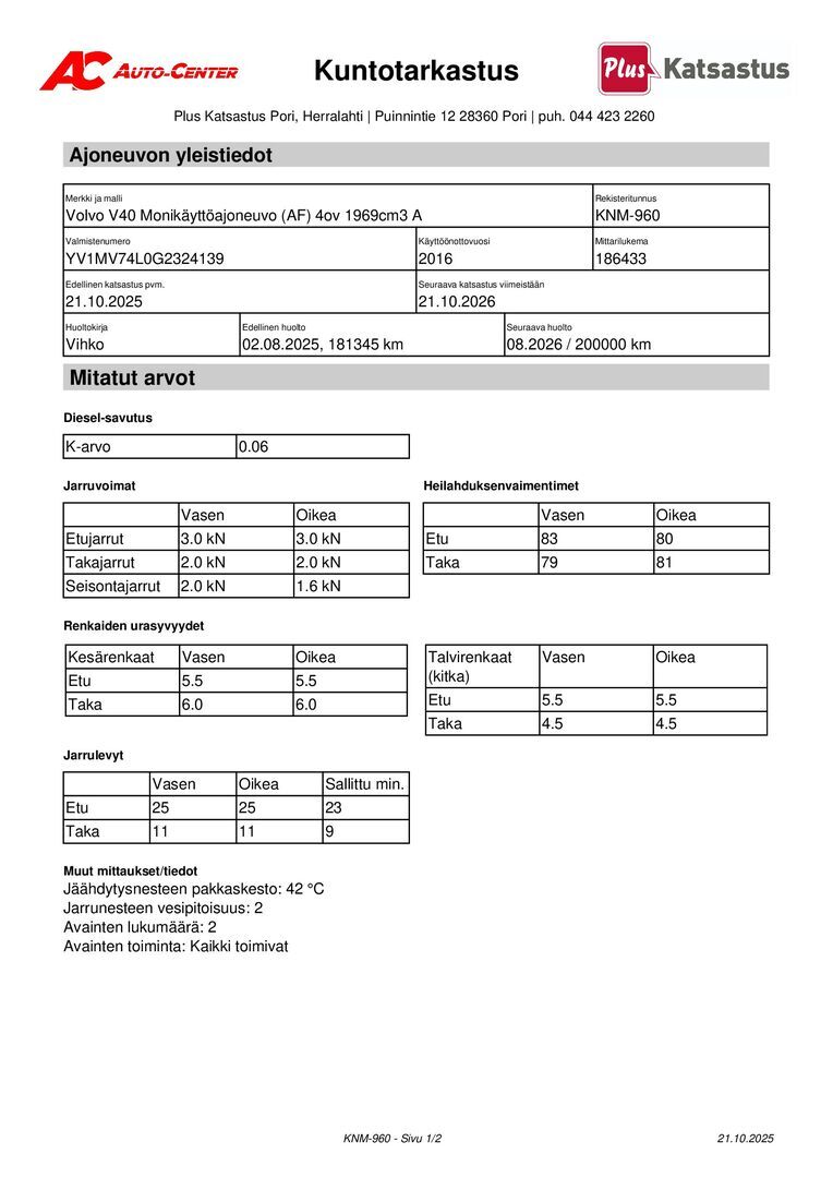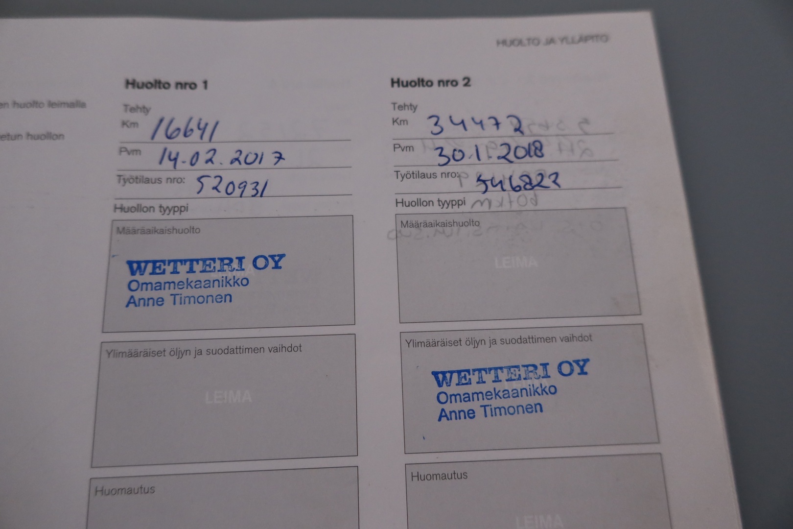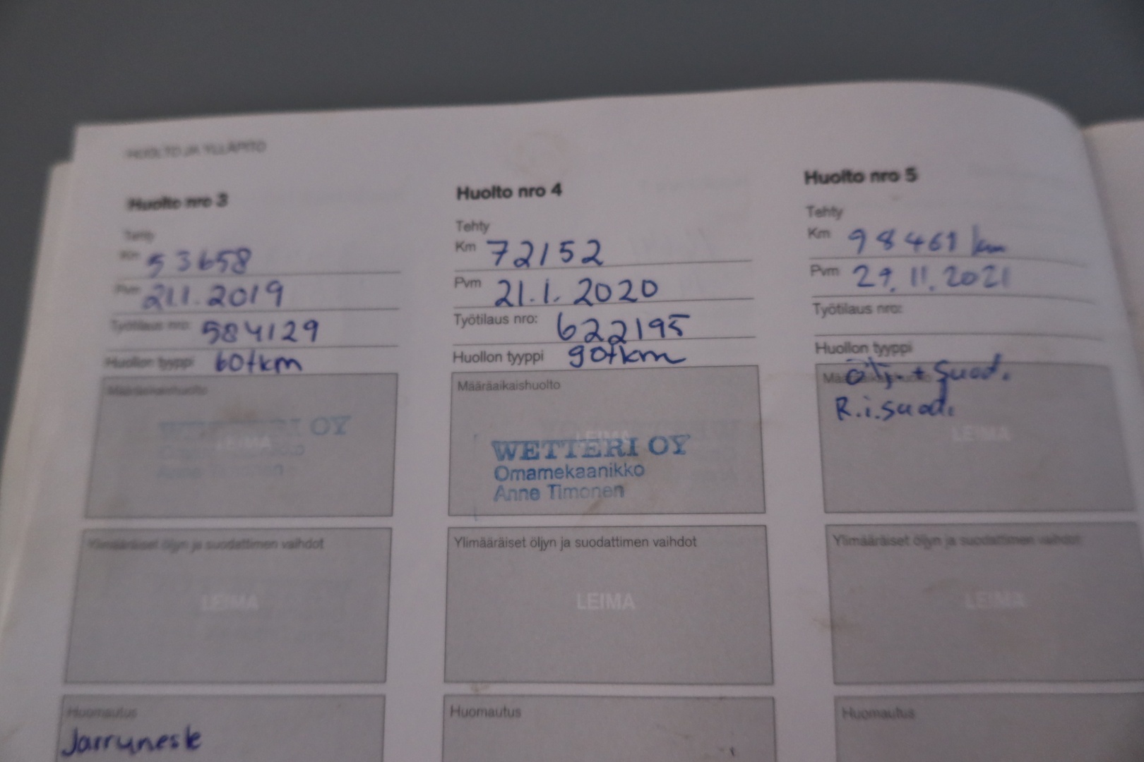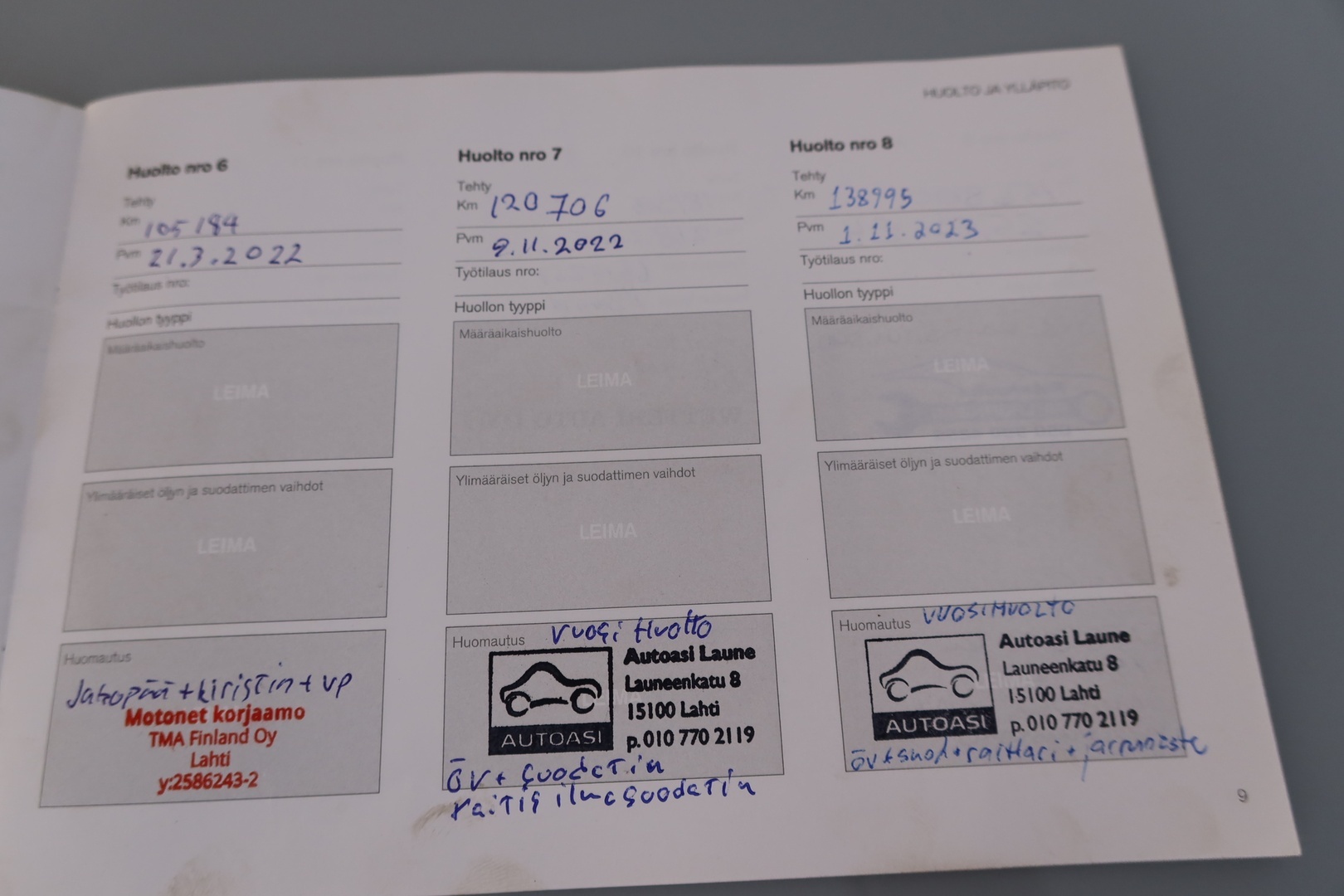Huoltokirja, viimeisin huolto 181tkm ja 8/2025, jakopää 15.11.24/158800km